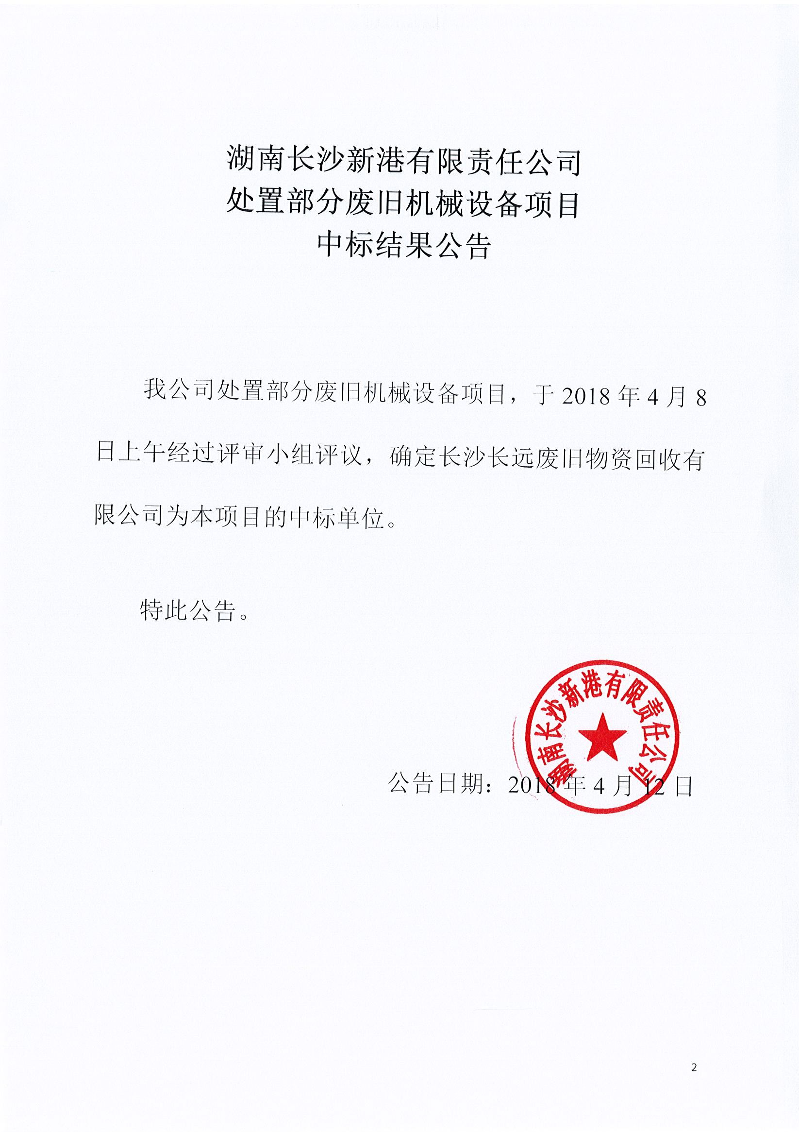 湖南長沙新港有限責任公司 處置部分廢舊機械設(shè)備項目中標結(jié)果公告