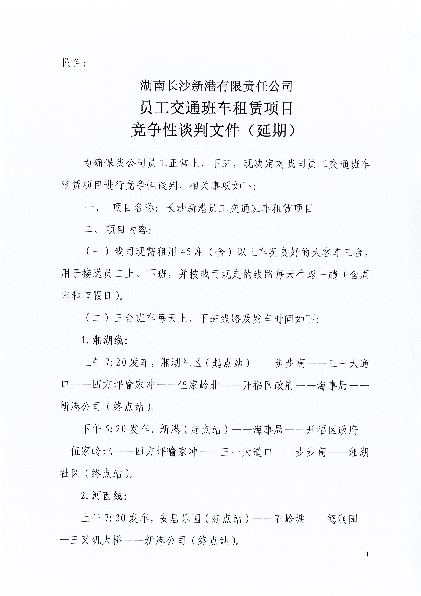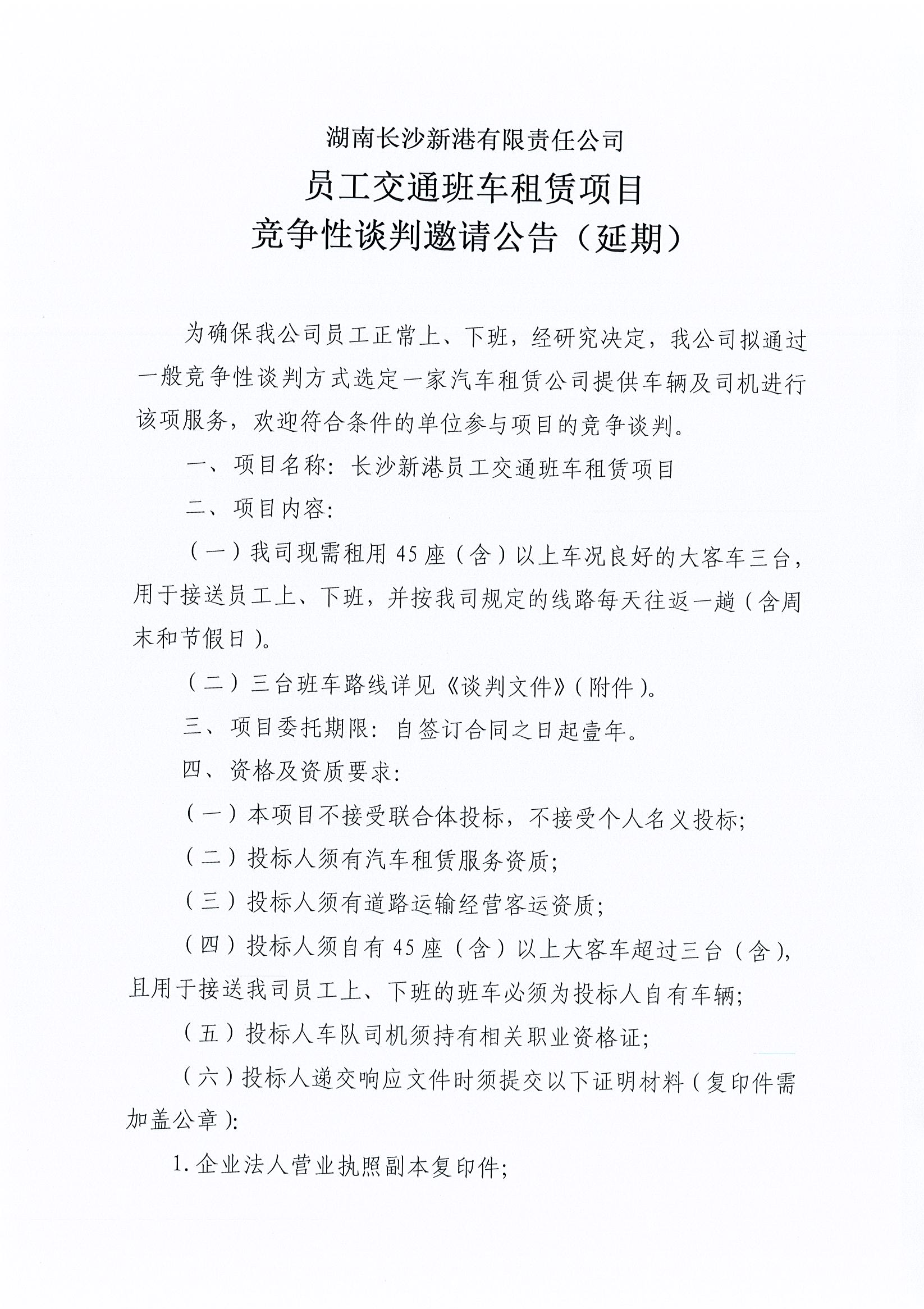 湖南長沙新港有限責(zé)任公司 員工交通班車租賃項目競爭性談判邀請公告(延期)