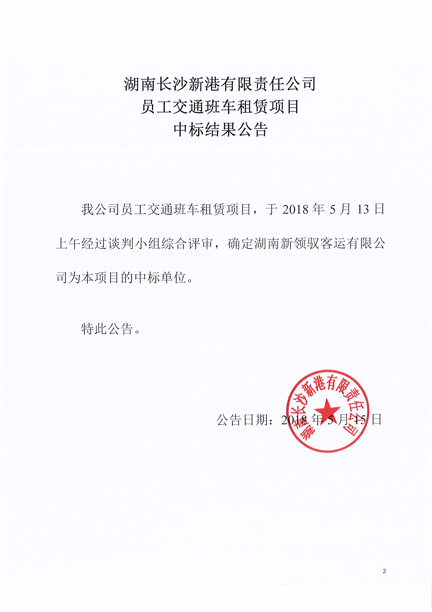 湖南長(zhǎng)沙新港有限責(zé)任公司 員工交通班車(chē)租賃項(xiàng)目中標(biāo)結(jié)果公告