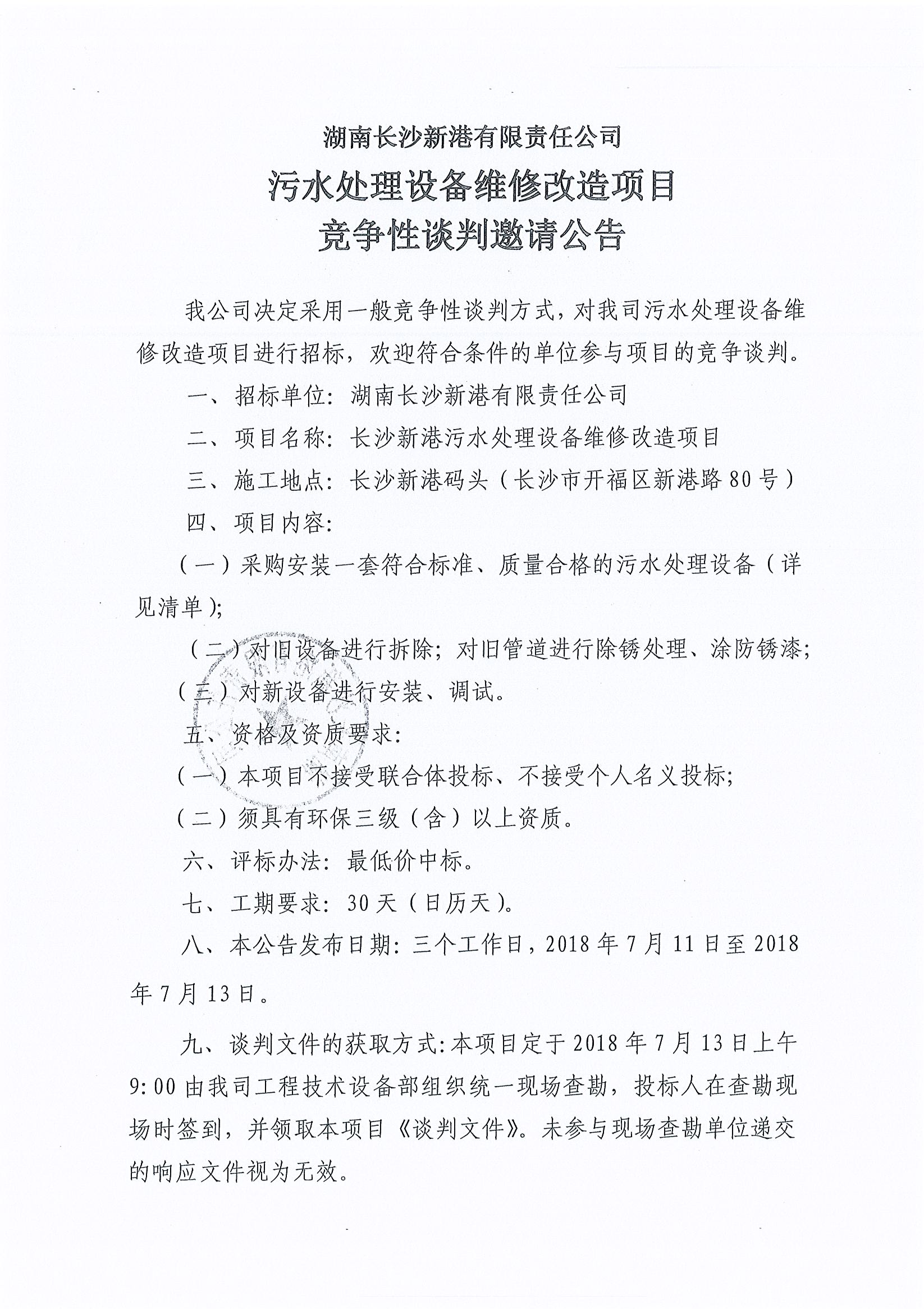湖南長沙新港有限責(zé)任公司 污水處理設(shè)備維修項目競爭性談判邀請公告