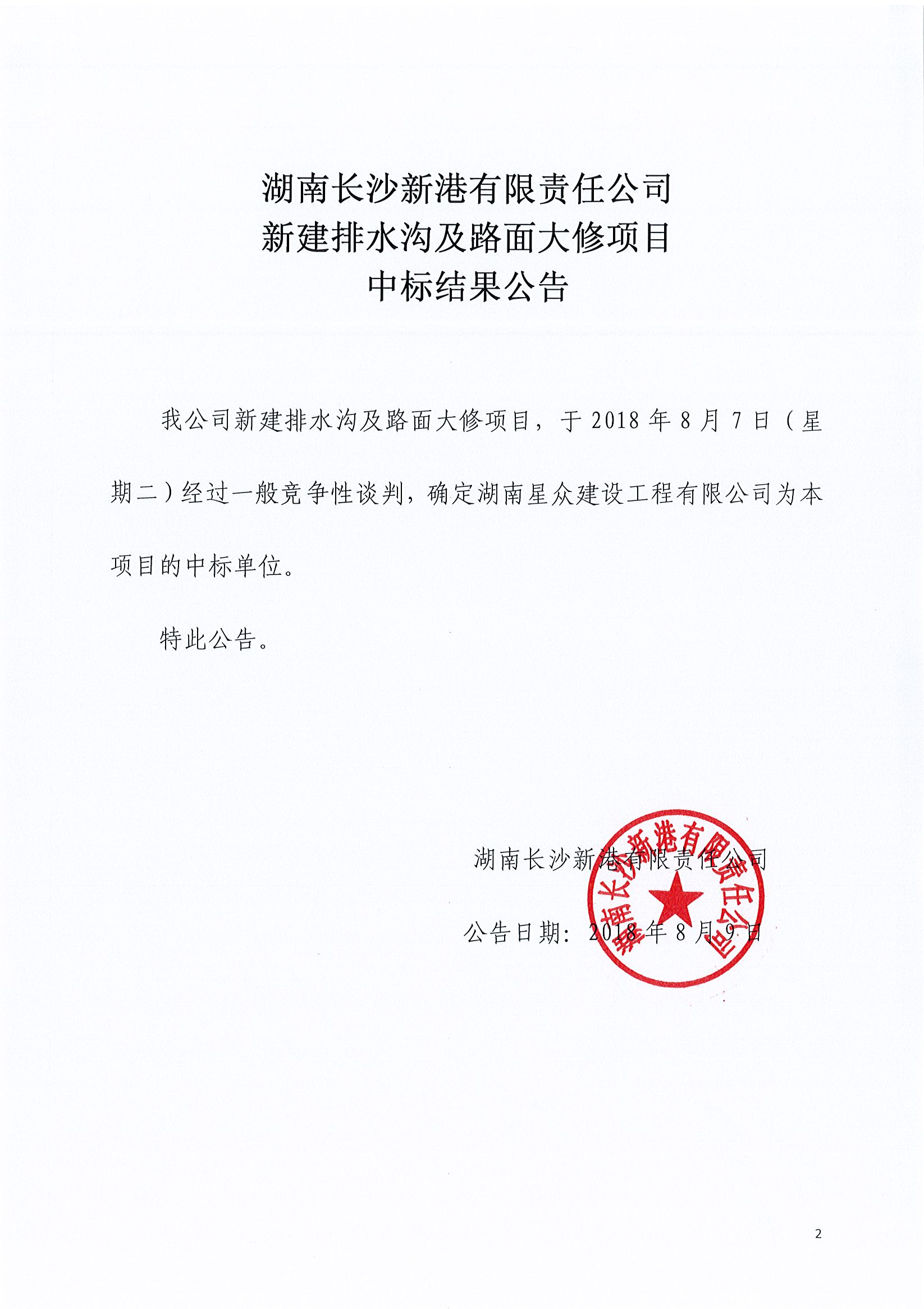 湖南長沙新港有限責任公司 新建排水溝及路面大修項目中標結(jié)果公告