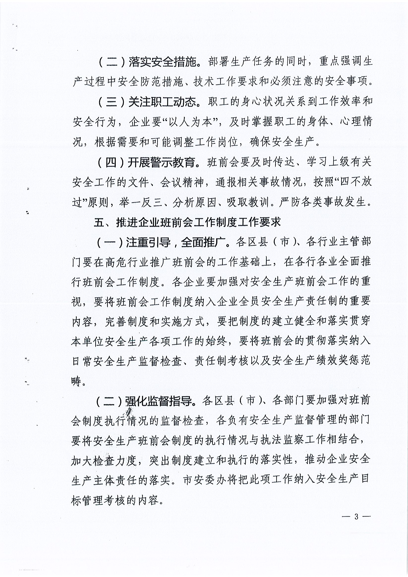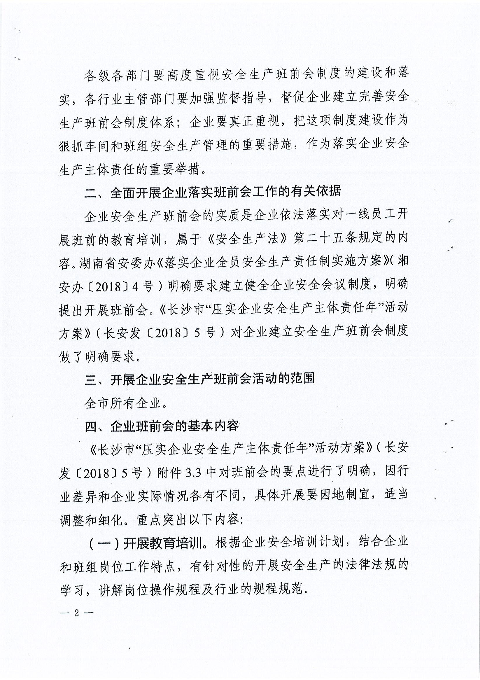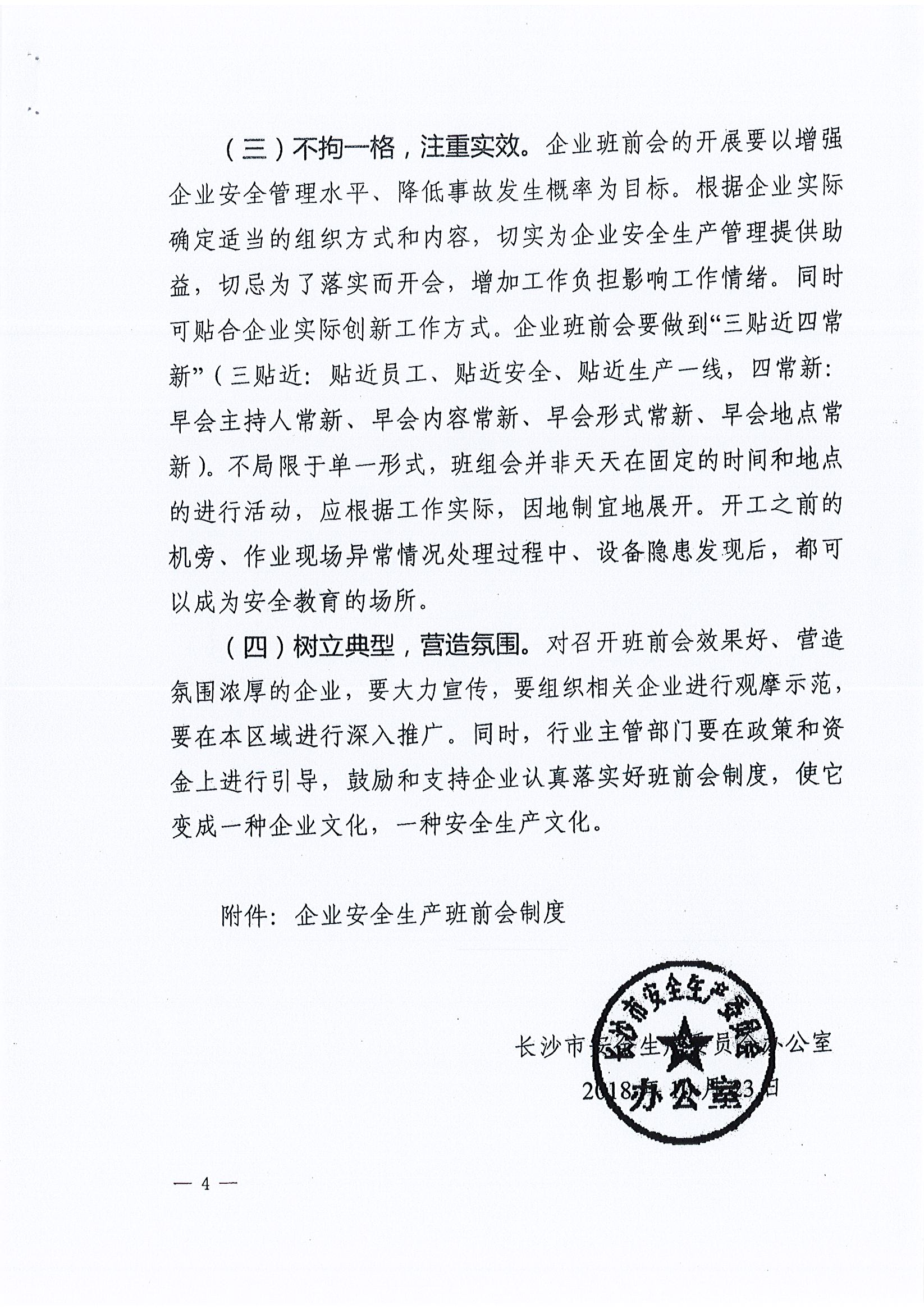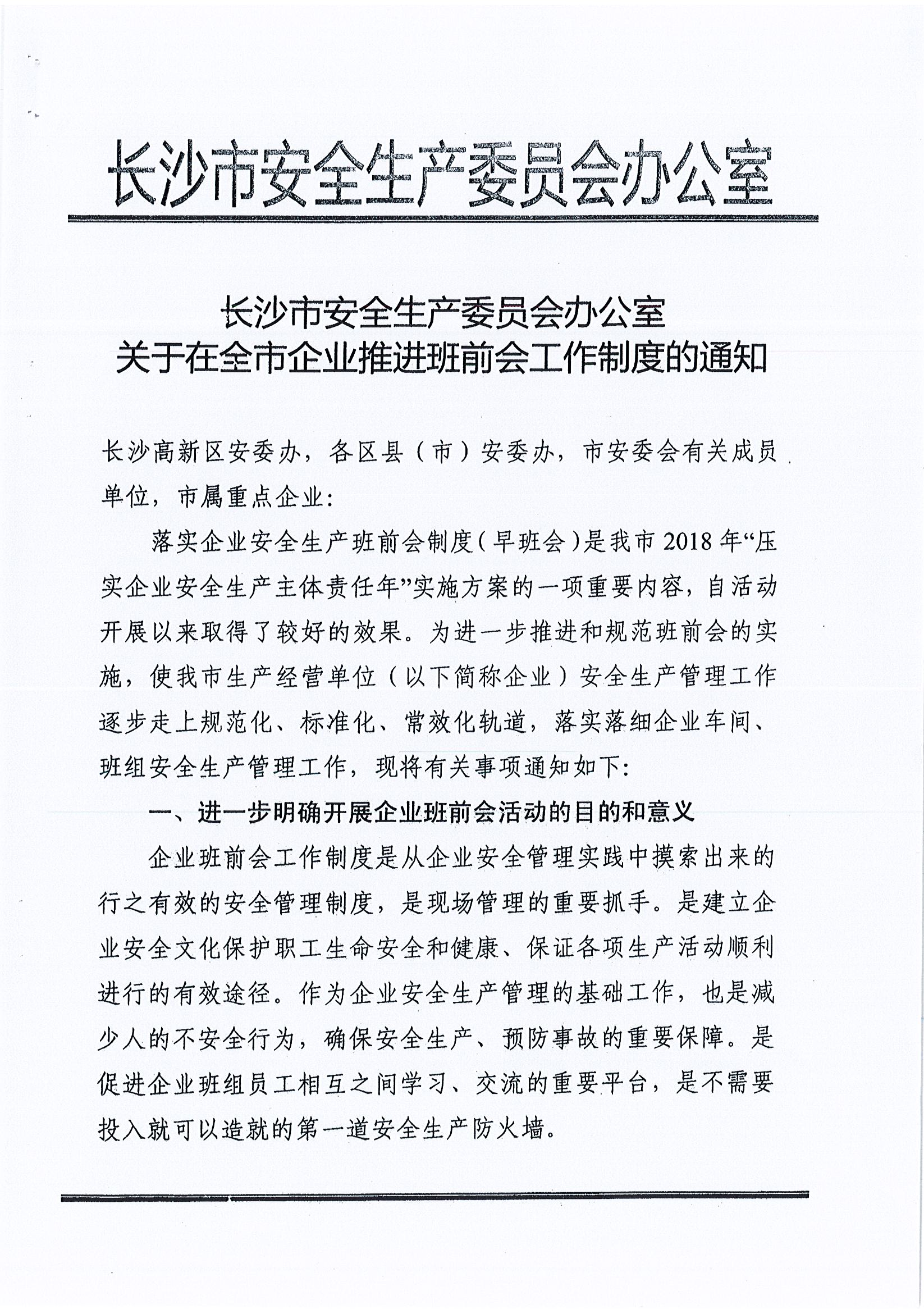 長沙市安全生產(chǎn)委員會(huì)辦公室關(guān)于在全市企業(yè)推進(jìn)班前會(huì)工作制度的通知