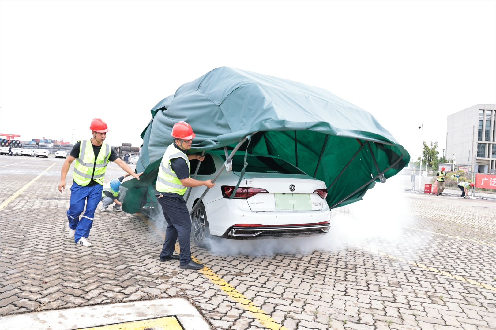 本次演練設(shè)置了庫場新能源汽車起火處置與短駁汽車失控起火處置兩個(gè)項(xiàng)目。隨著現(xiàn)場指揮一聲令下,演練正式開始。滾裝碼頭庫場區(qū)一輛新能源汽車冒起濃煙并伴有明火,應(yīng)急預(yù)案立即啟動(dòng)。在轉(zhuǎn)移周邊新能源汽車后,搶險(xiǎn)救援組用新能源汽車滅火罩迅速罩住起火車輛隔絕火源,同時(shí)將嵌入式滅火裝置推送至起火車輛底盤下方噴水降溫。該滅火罩和嵌入式滅火裝置均為長沙新港公司自主研發(fā),能有效應(yīng)對(duì)新能源汽車起火險(xiǎn)情。通過雙管齊下精準(zhǔn)壓制了現(xiàn)場火勢,火情得到快速解除。