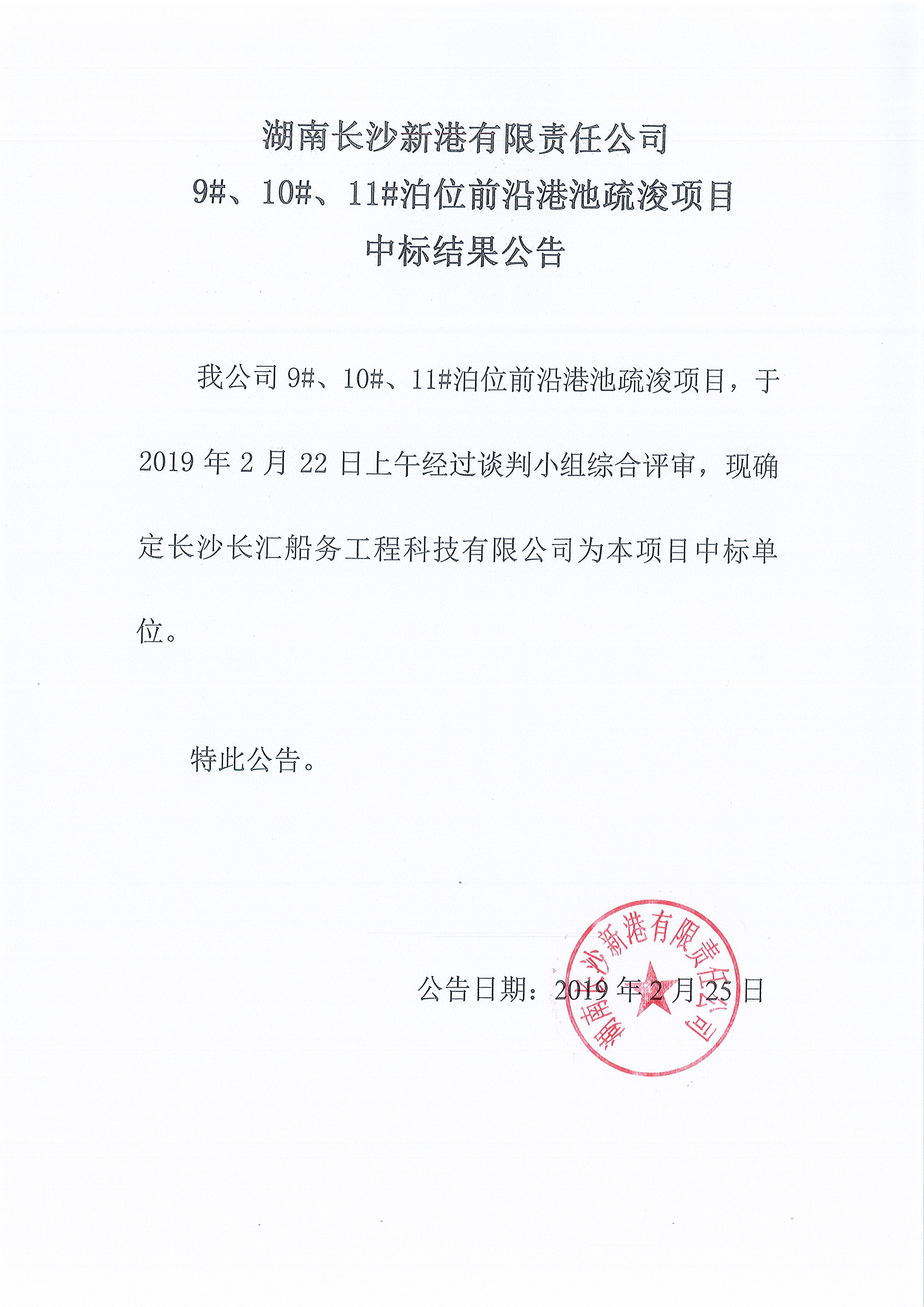 湖南長沙新港有限責(zé)任公司 9#、10#、11#泊位前沿港池疏浚項(xiàng)目中標(biāo)結(jié)果公告
