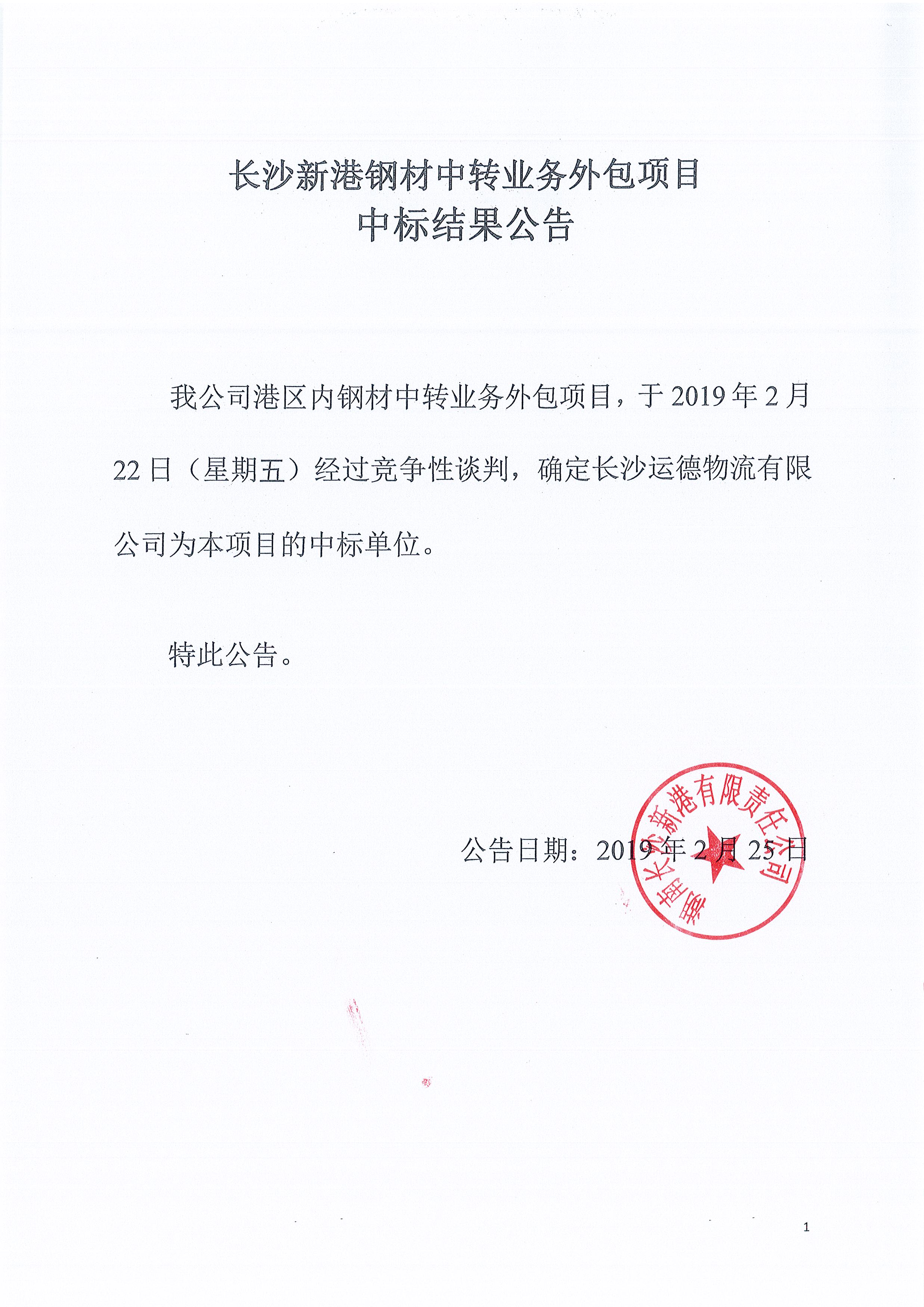 長沙新港鋼材中轉(zhuǎn)業(yè)務(wù)外包項目中標結(jié)果公告
