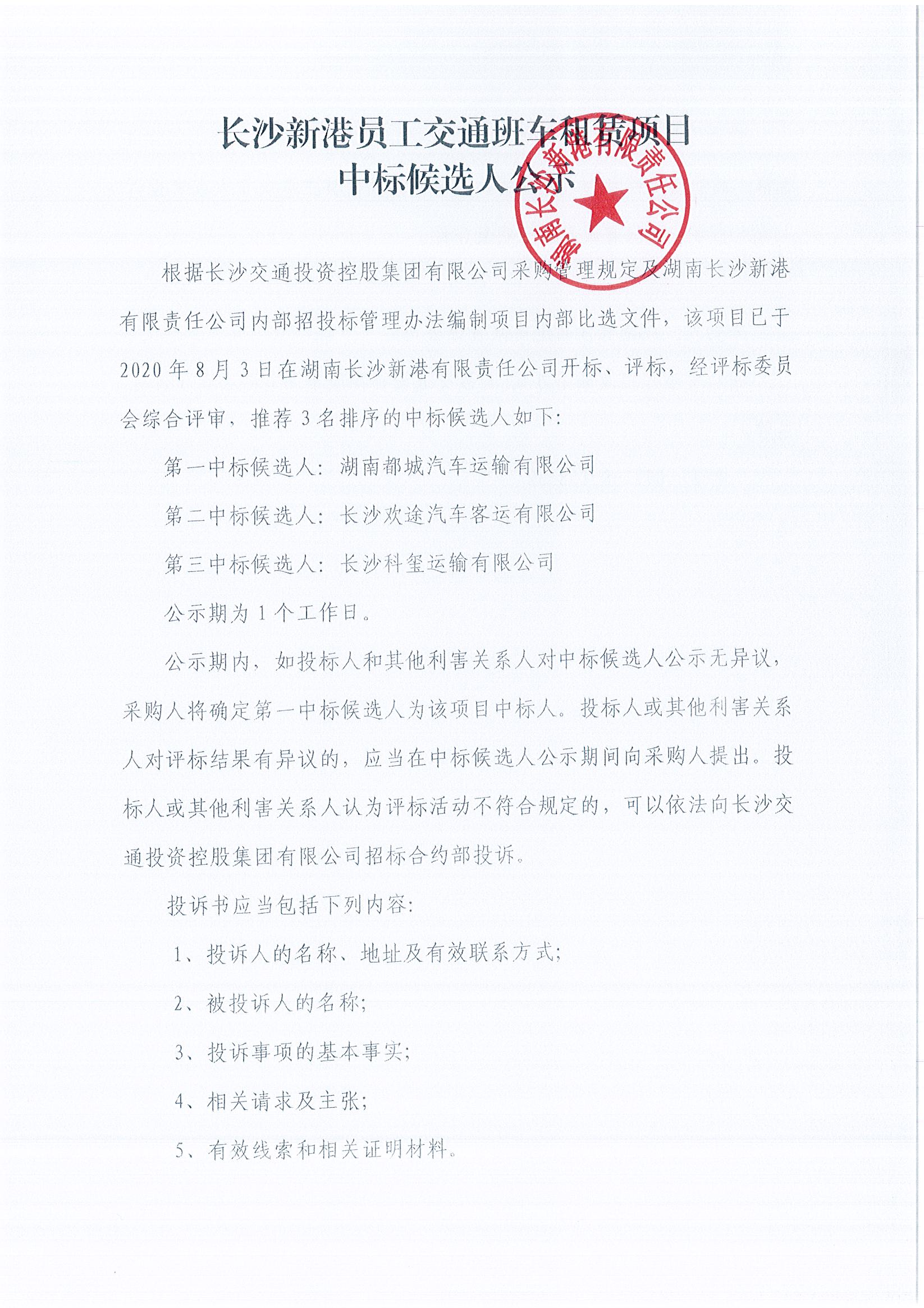長沙新港員工交通班車租賃項目中標(biāo)候選人公示