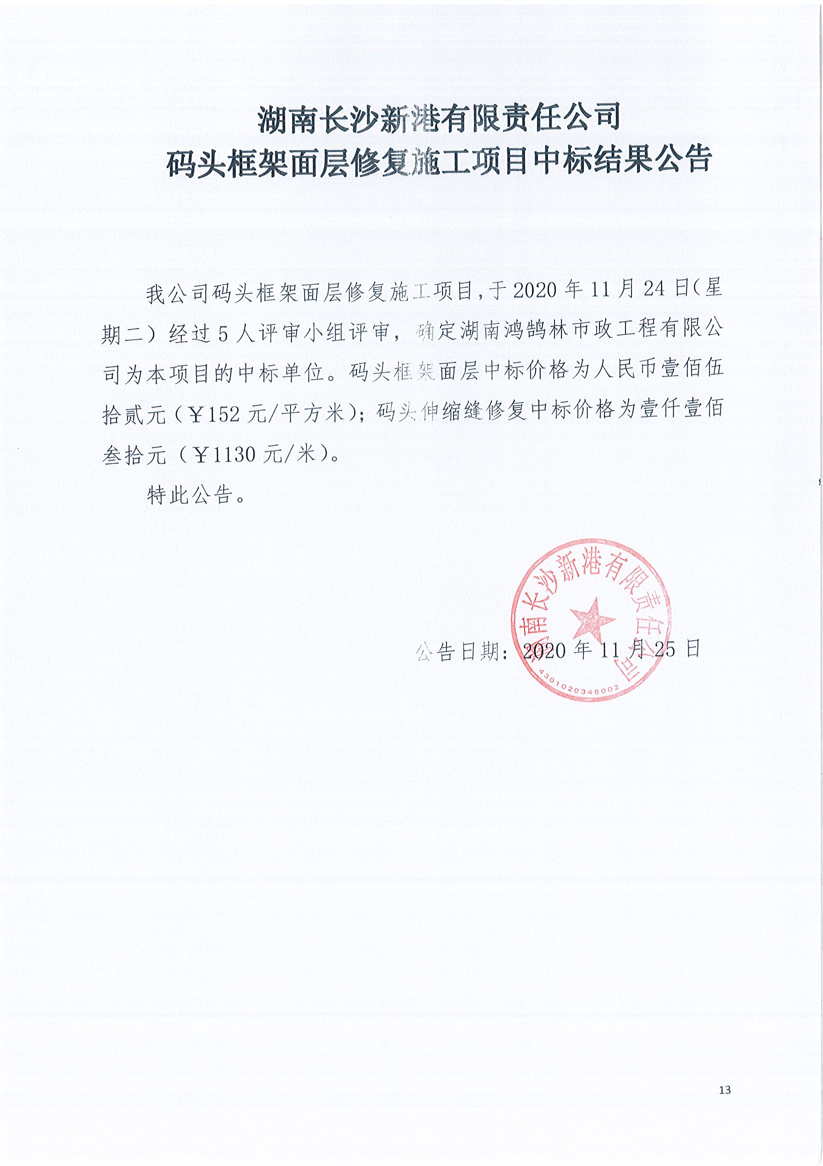 湖南長(zhǎng)沙新港有限責(zé)任公司碼頭框架面層修復(fù)施工項(xiàng)目中標(biāo)結(jié)果公告