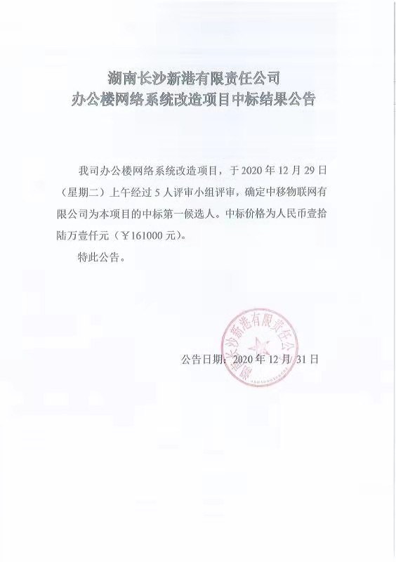 湖南長沙新港有限責(zé)任公司辦公樓網(wǎng)絡(luò)系統(tǒng)改造項目中標結(jié)果公告