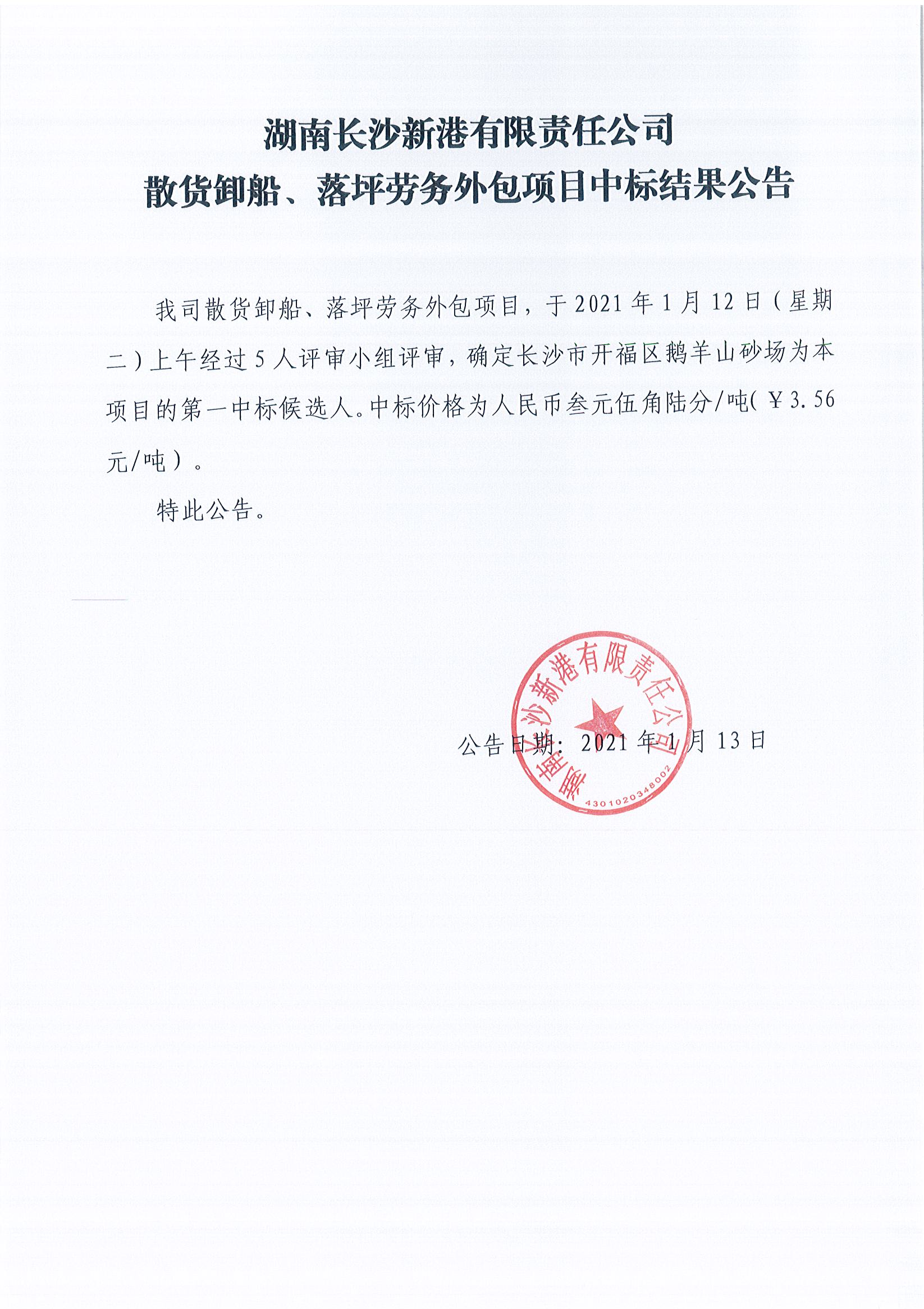 湖南長沙新港有限責(zé)任公司散貨卸船、落坪勞務(wù)外包項(xiàng)目中中標(biāo)結(jié)果公示
