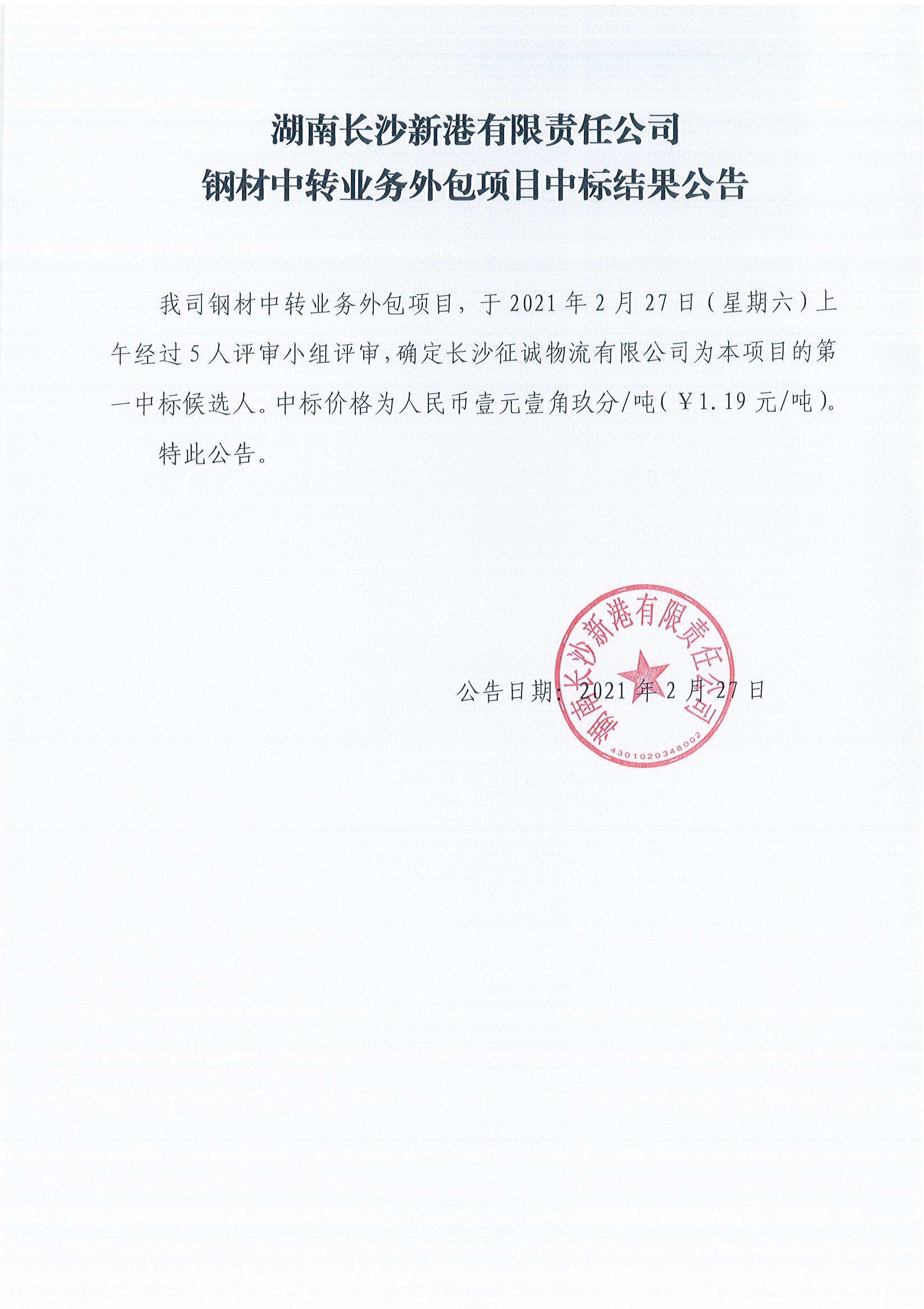 湖南長沙新港有限責(zé)任公司鋼材中轉(zhuǎn)業(yè)務(wù)外包項(xiàng)目中標(biāo)結(jié)果公告