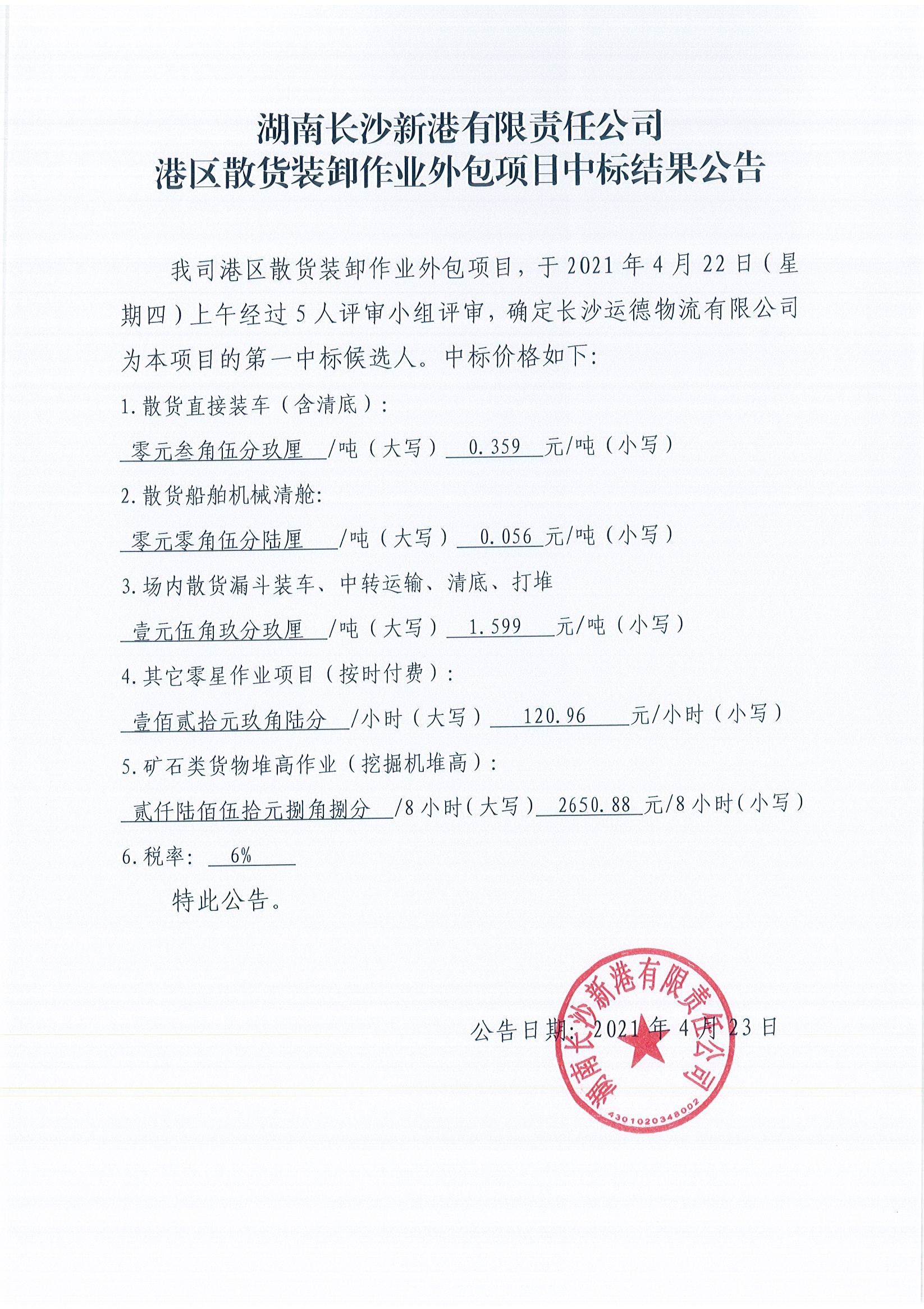 湖南長沙新港有限責(zé)任公司港區(qū)散貨裝卸作業(yè)外包項(xiàng)目中標(biāo)結(jié)果公告