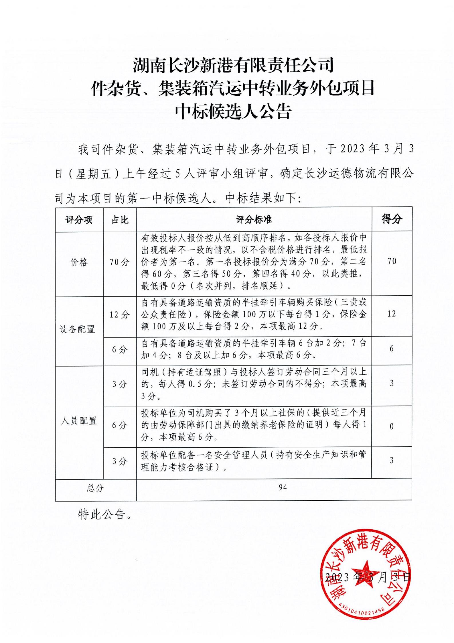 湖南長沙新港有限責(zé)任公司件雜貨、集裝箱汽運(yùn)中轉(zhuǎn)業(yè)務(wù)外包項(xiàng)目中標(biāo)候選人公告