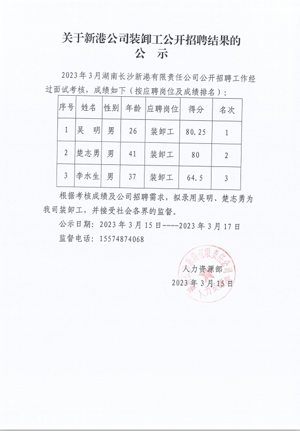 新港公司裝卸工公開招聘結(jié)果的公示