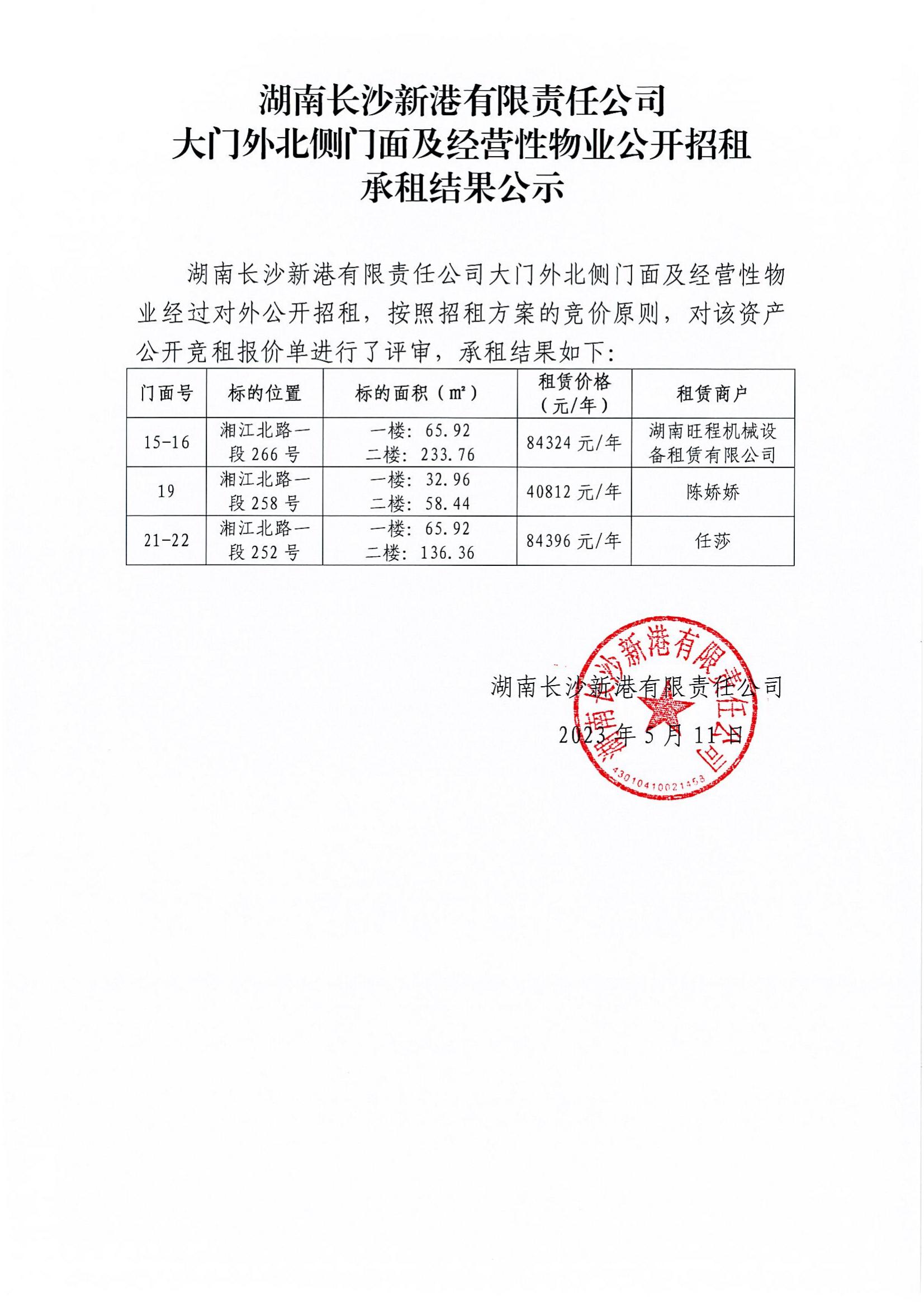 新港公司大門外北側(cè)門面及經(jīng)營(yíng)性物業(yè)公開(kāi)招租承租結(jié)果公示
