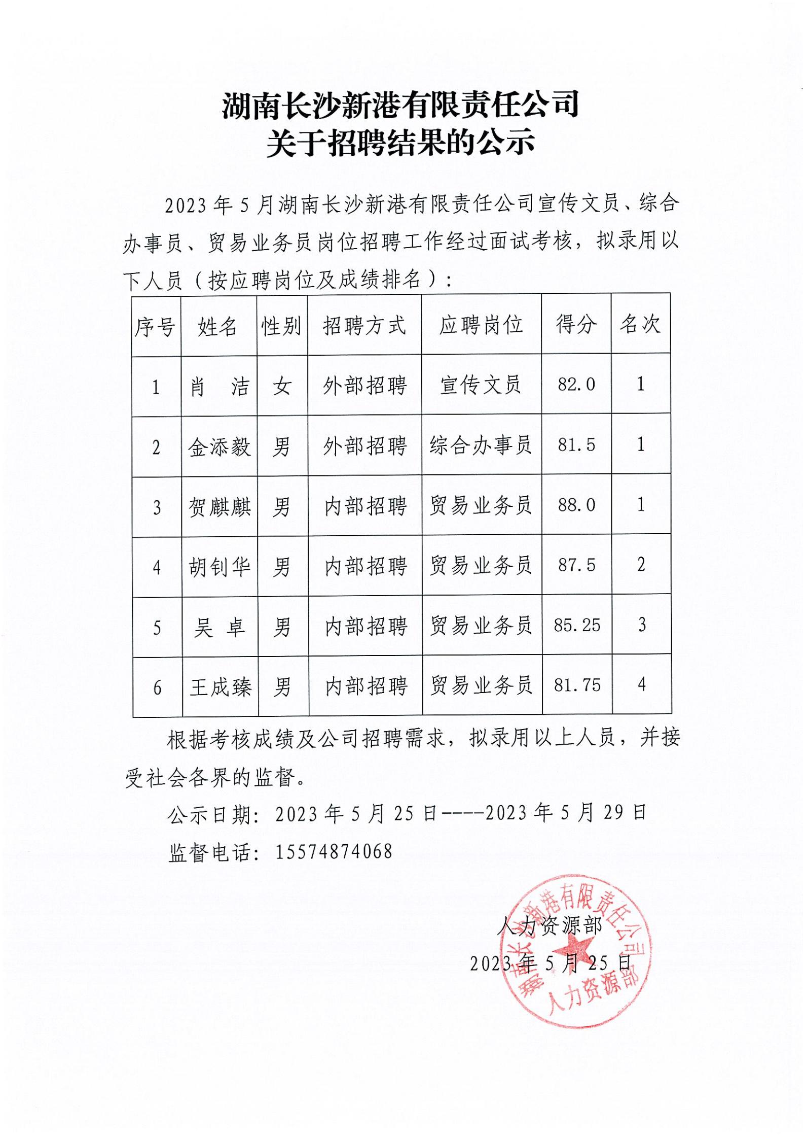 湖南長(zhǎng)沙新港有限責(zé)任公司關(guān)于招聘結(jié)果的公示