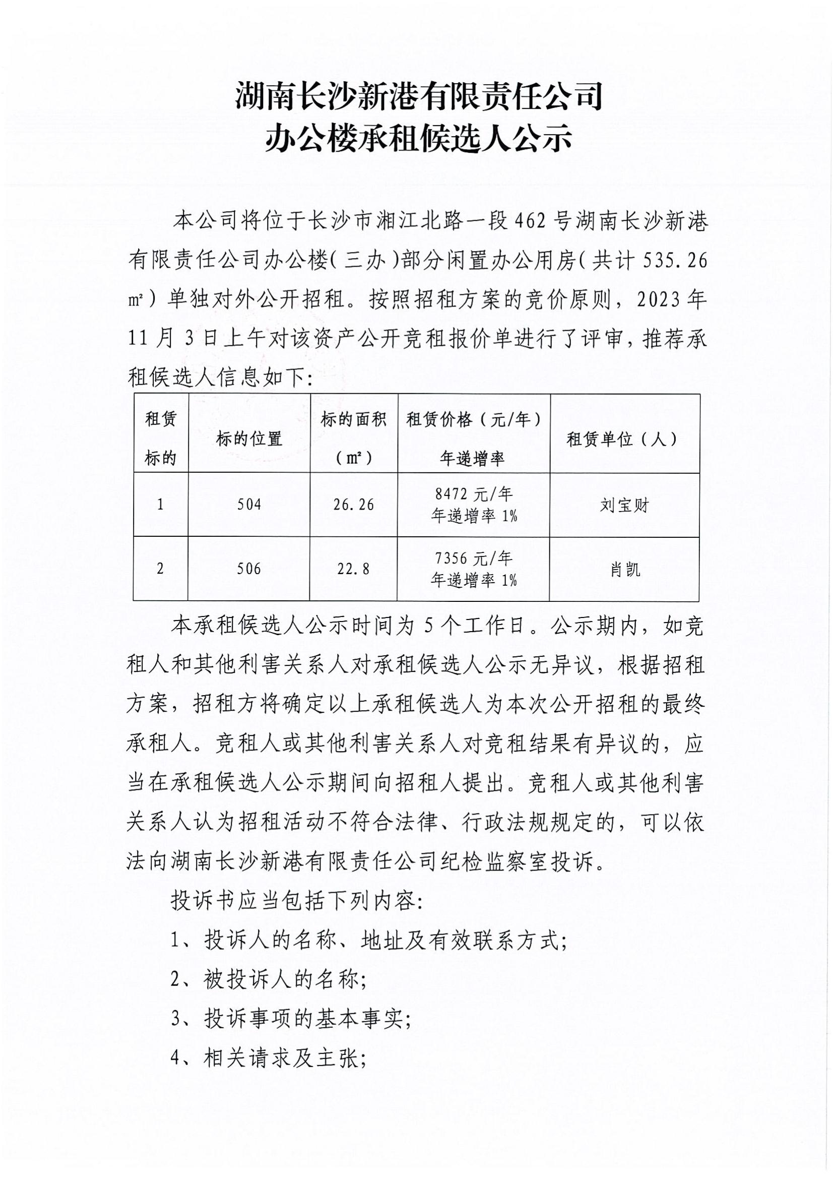 湖南長沙新港有限責(zé)任公司辦公樓承租候選人公示