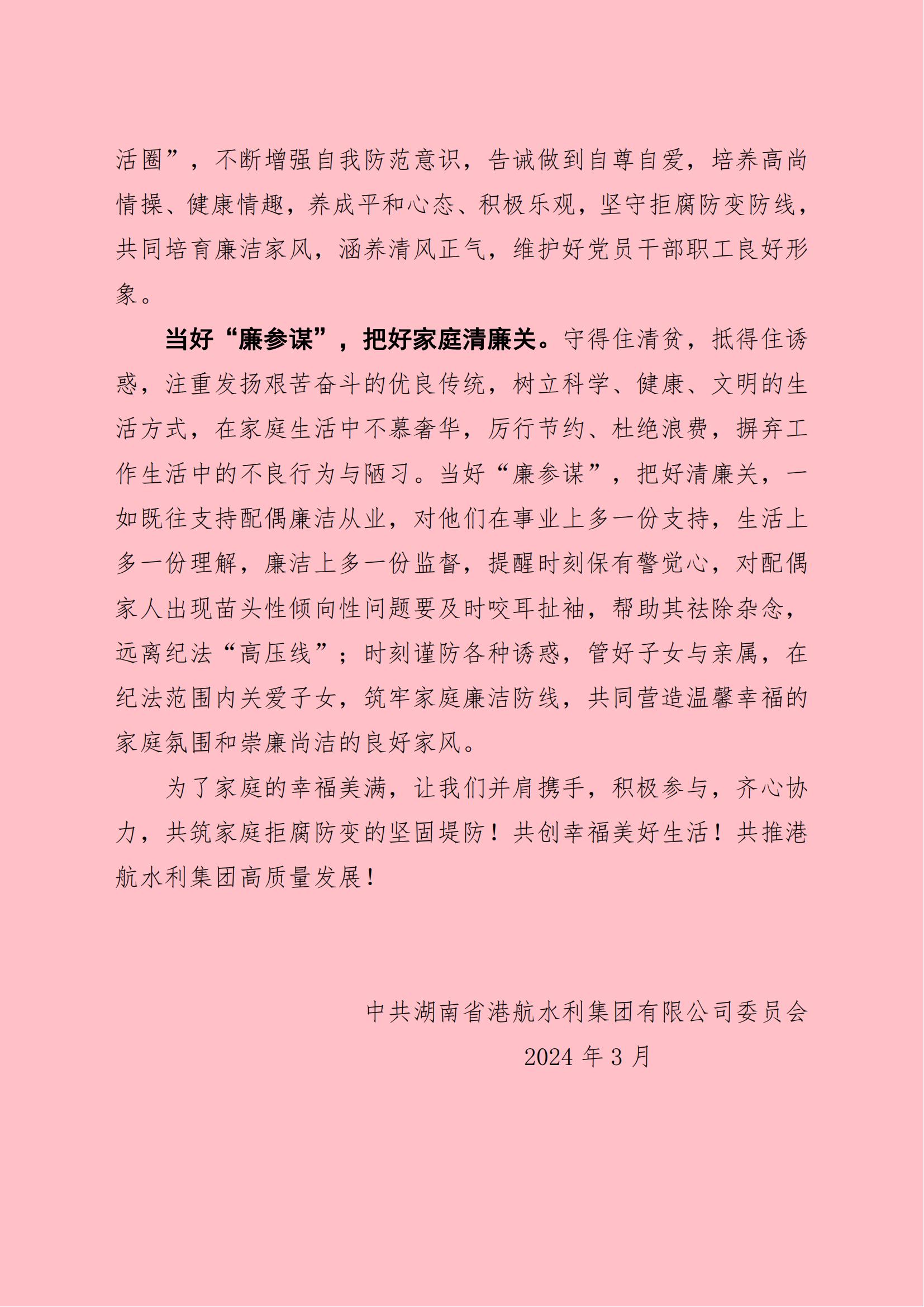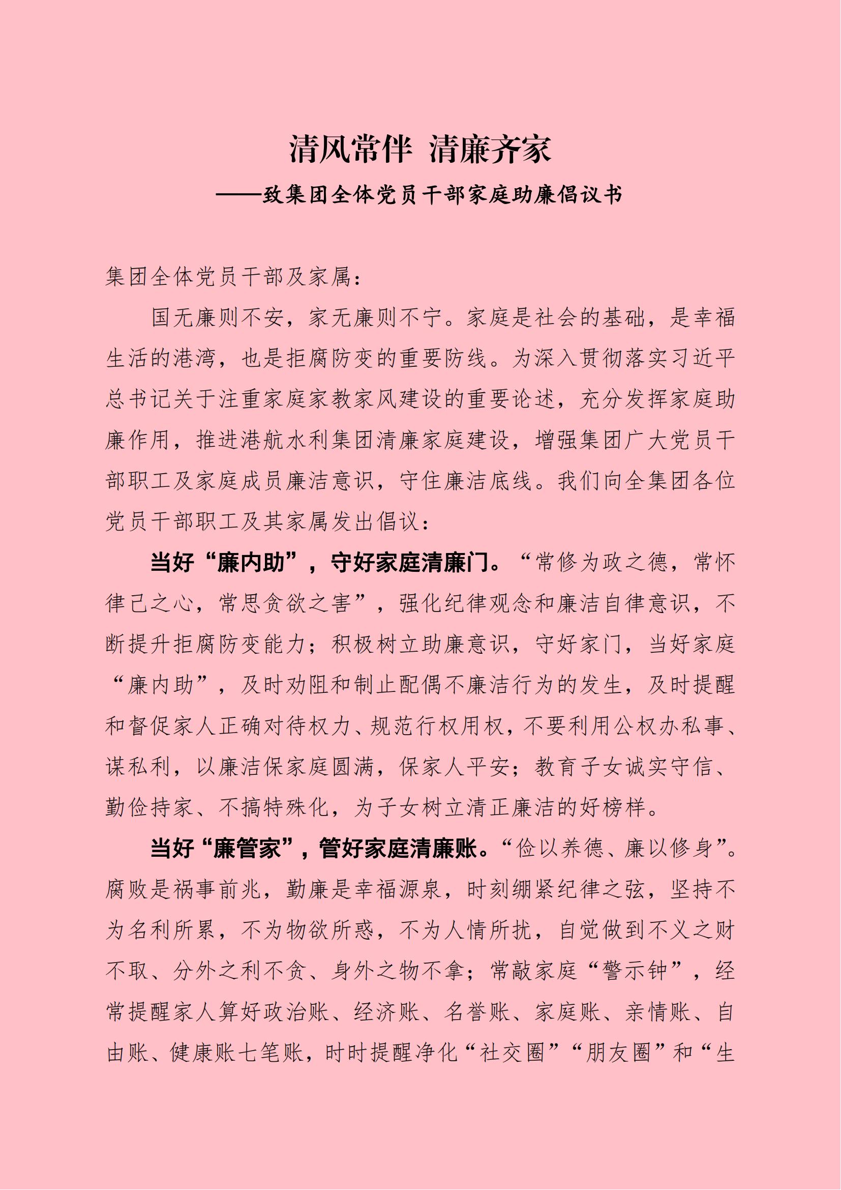 清風常伴 清廉齊家—致集團全體黨員干部家庭助廉倡議書