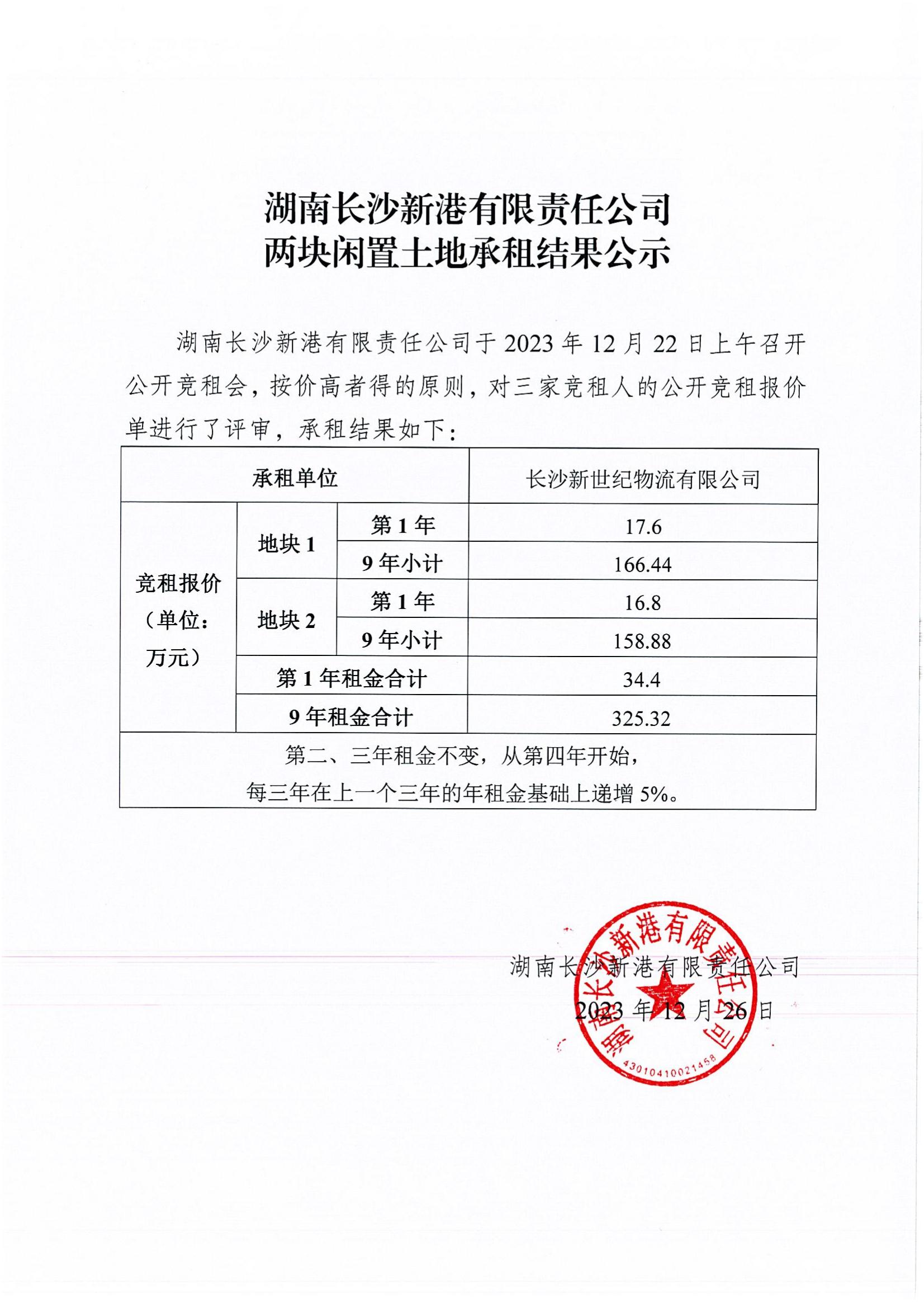 長沙新港兩塊閑置土地承租結(jié)果公示