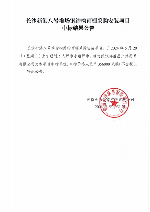 長沙新港八號堆場鋼結(jié)構(gòu)雨棚采購安裝項目中標結(jié)果公示