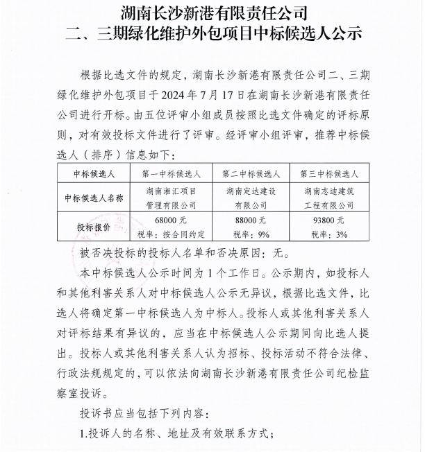 湖南長沙新港有限責(zé)任公司二、三期綠化維護外包項目中標(biāo)候選人公示