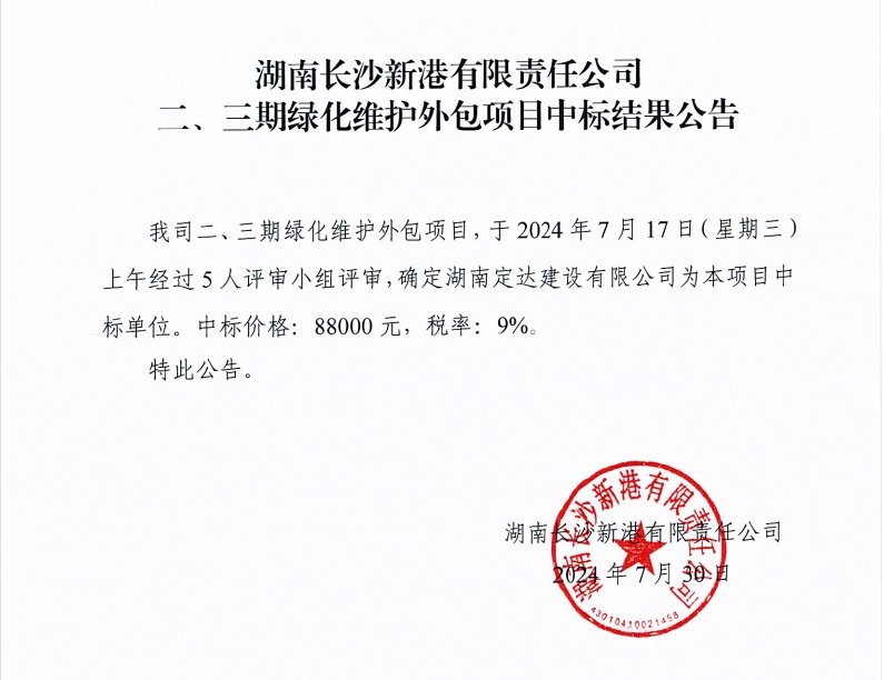 湖南長沙新港有限責(zé)任公司二、三期綠化維護外包項目中標(biāo)結(jié)果公告